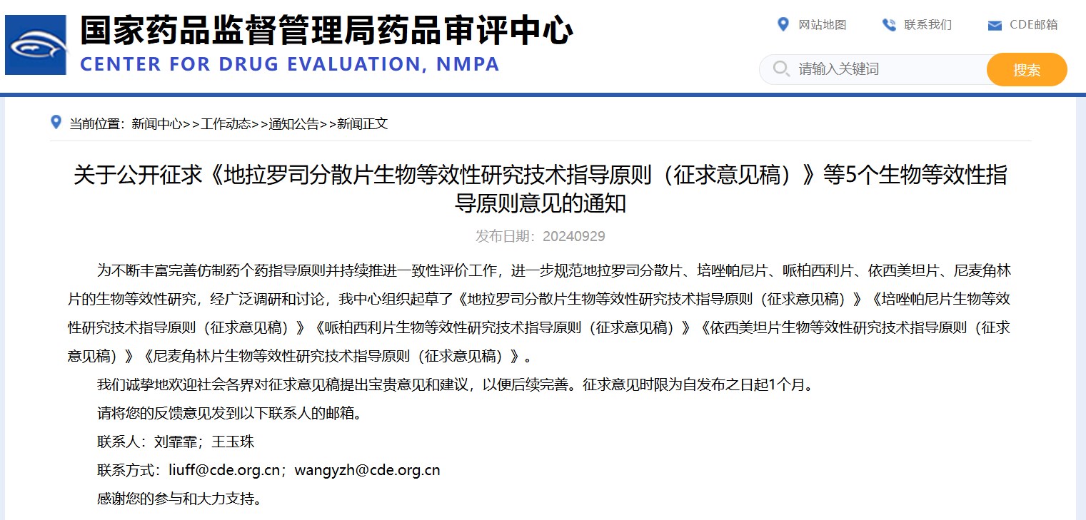关于公开征求《地拉罗司分散片生物等效性研究技术指导原则(征求意见稿)》等5个生物等效性指导原则意见的通知