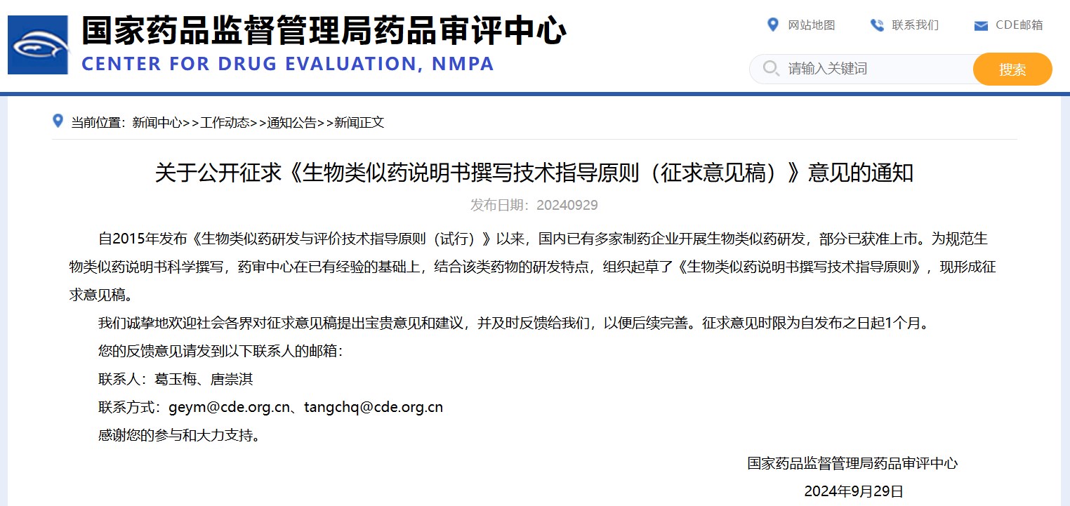 关于公开征求《生物类似药说明书撰写技术指导原则(征求意见稿)》意见的通知