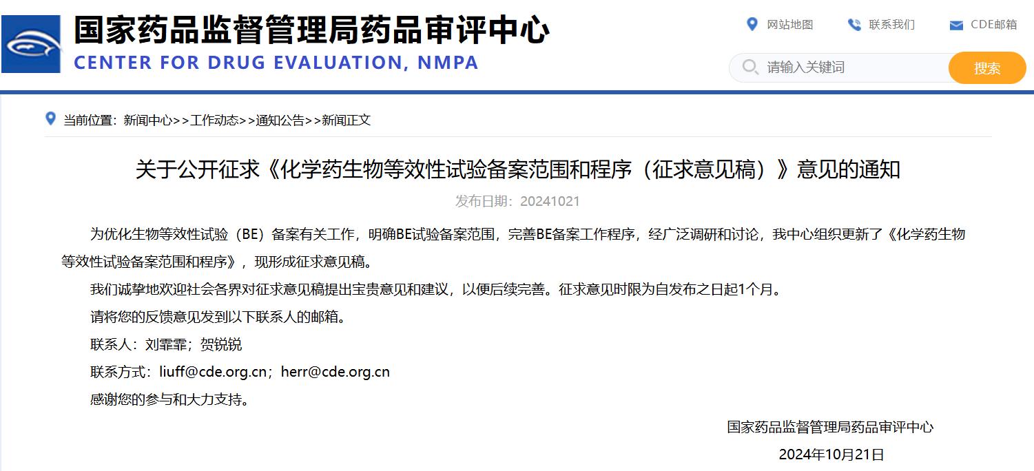 关于公开征求《化学药生物等效性试验备案范围和程序(征求意见稿)》意见的通知