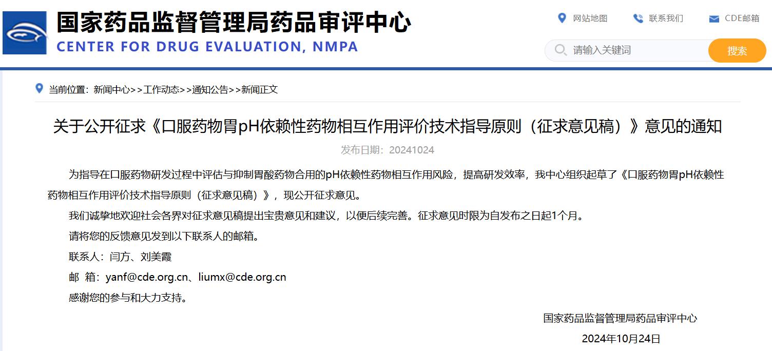 关于公开征求《口服药物胃ph依赖性药物相互作用评价技术指导原则(征求意见稿)》意见的通知国家药监局