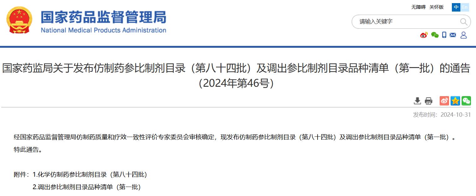 关于发布仿制药参比制剂目录(第八十四批)及调出参比制剂目录品种清单(第一批)的通告(2024年第46号)