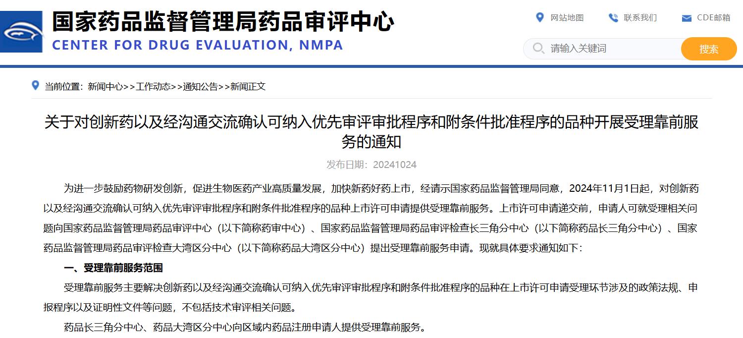 关于对创新药以及经沟通交流确认可纳入优先审评审批程序和附条件批准程序的品种开展受理靠前服务的通知