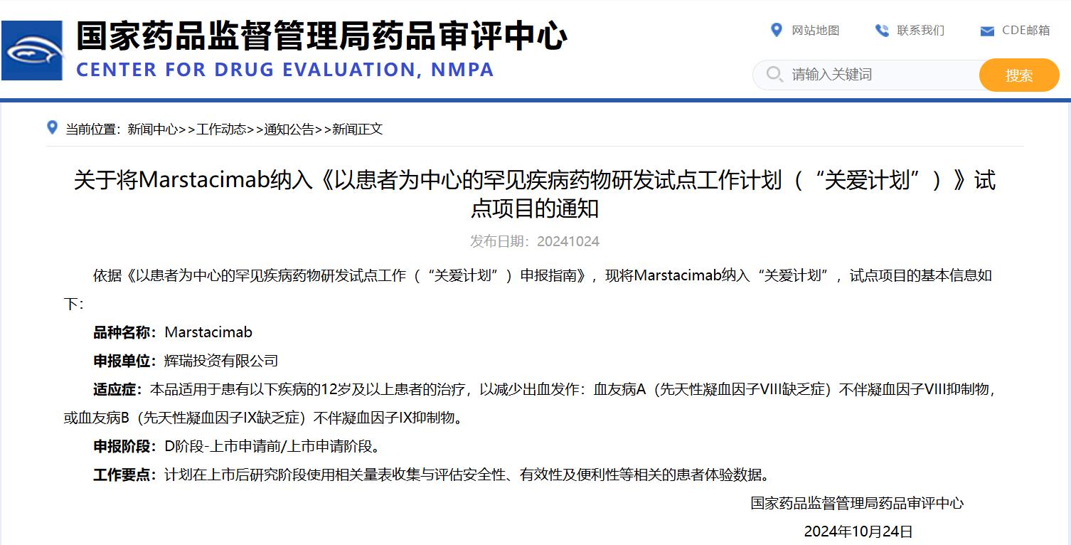关于将marstacimab纳入《以患者为中心的罕见疾病药物研发试点工作计划(“关爱计划”)》试点项目的通知