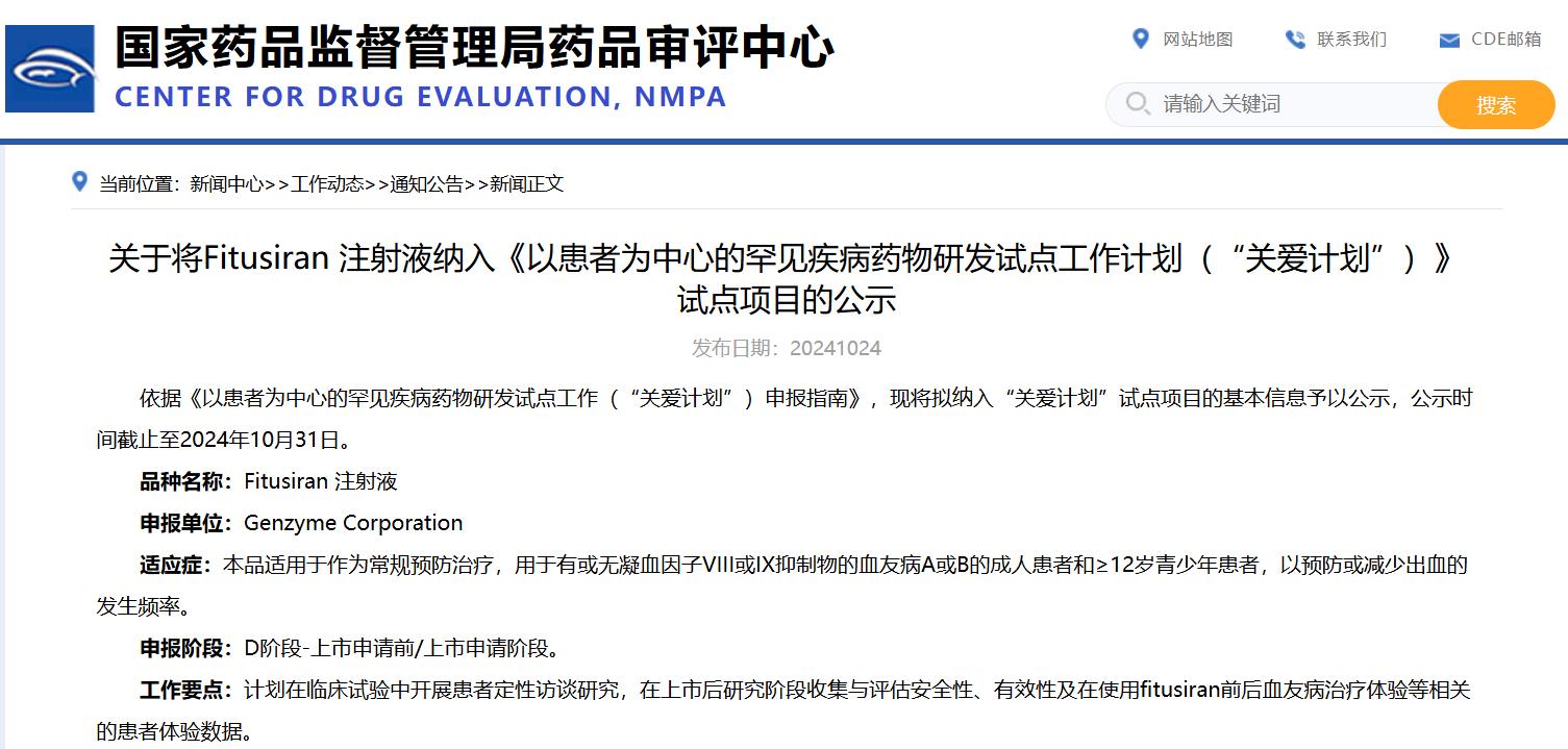 关于将fitusiran 注射液纳入《以患者为中心的罕见疾病药物研发试点工作计划(“关爱计划”)》试点项目的公示