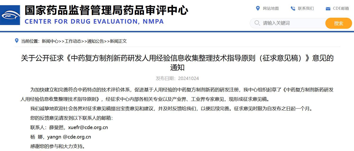 关于公开征求《中药复方制剂新药研发人用经验信息收集整理技术指导原则(征求意见稿)》意见的通知